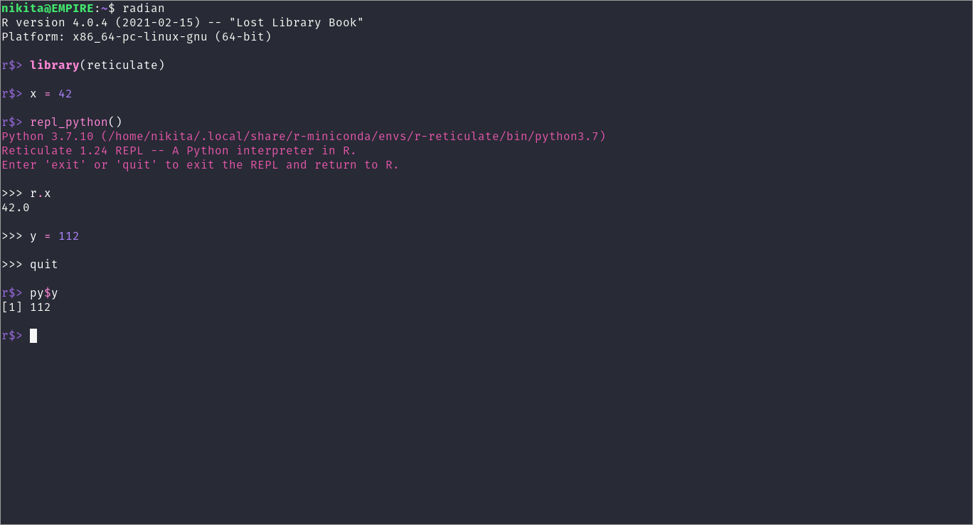 This first option allows us to switch between R and Python sessions in terminal and access shared objects.